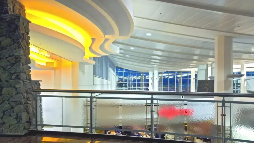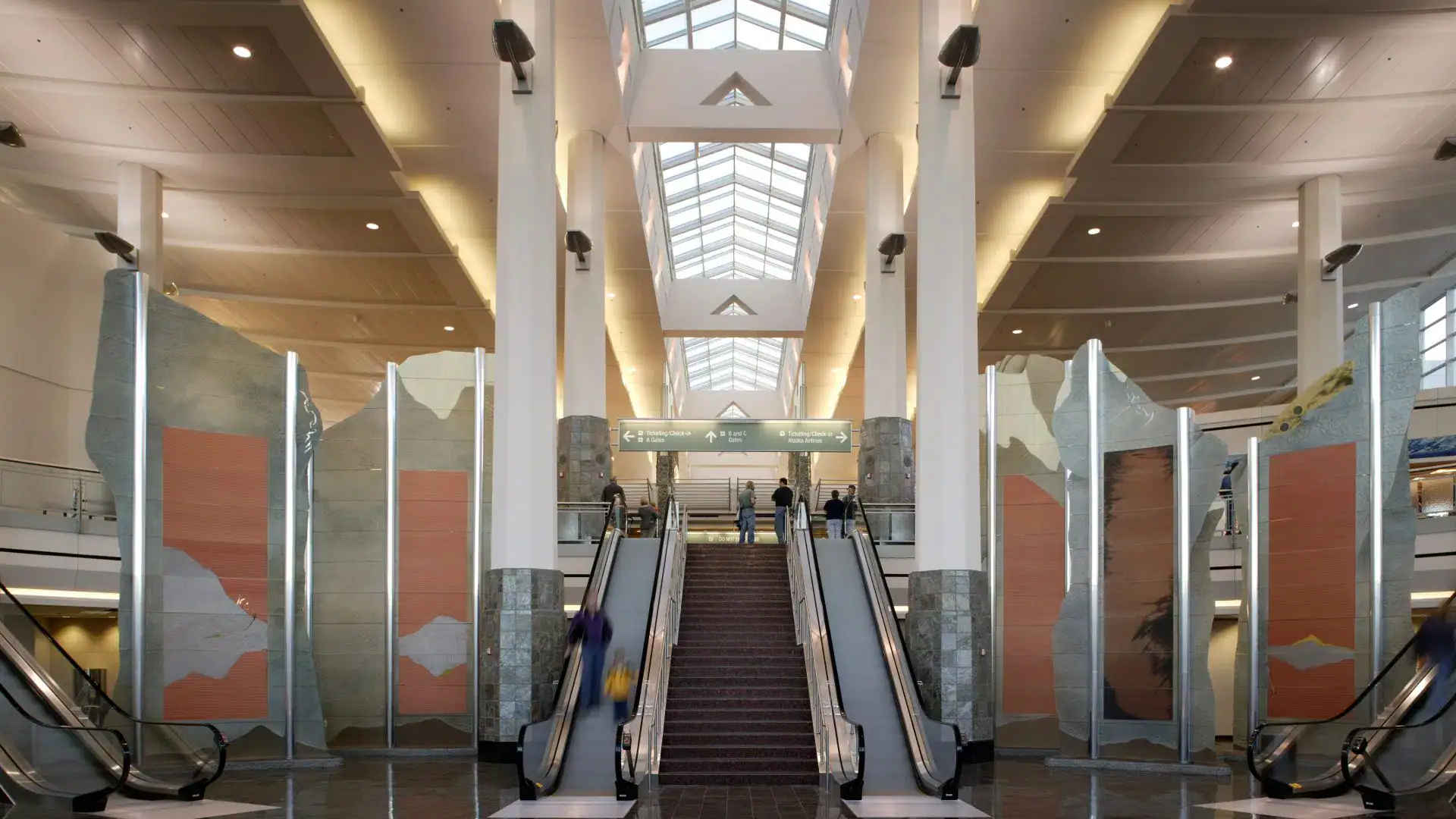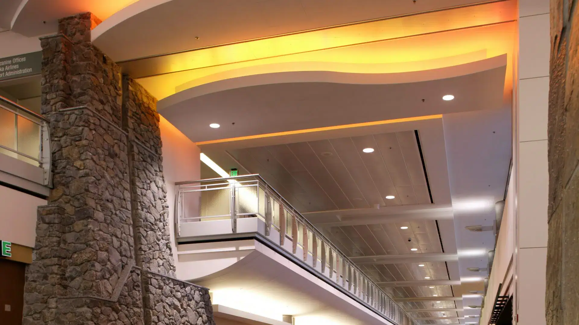 The project was designed around a theme of dramatic juxtaposition – state-of-the-art technology set against a natural landscape. Throughout the terminal, the trappings of modern airport technology are combined with abstracted natural features such as rock outcroppings, glacial walls, meandering pathways and ethereal lighting evocative of the Alaska landscape.